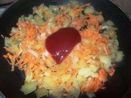 9. Добавить к луку морковь, обжаривать на сильном огне 2 – 3 минуты.
