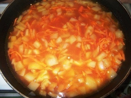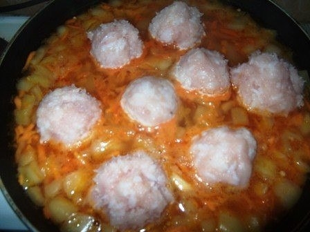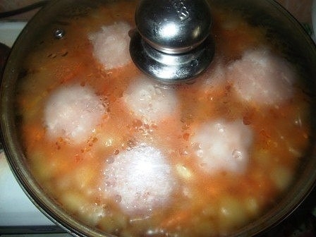 14. Из фарша сформировать фрикадельки (из указанного количества получается около 8 штук); опустить фрикадельки в кипящий бульон с овощами.