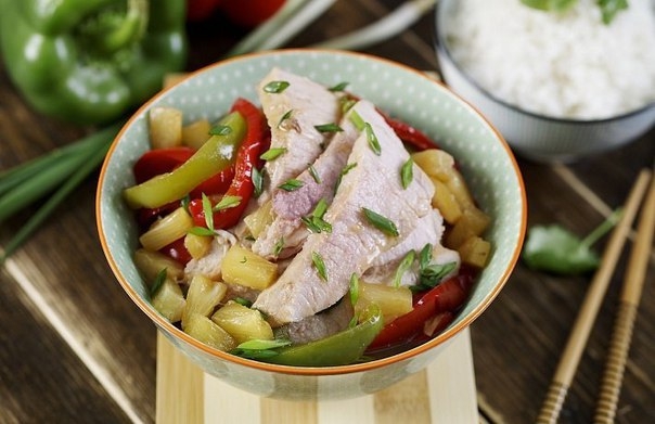 4 Готовую свинину нарежьте ломтиками и присыпьте измельченным зеленым луком. Подавайте с отваренным рисом.