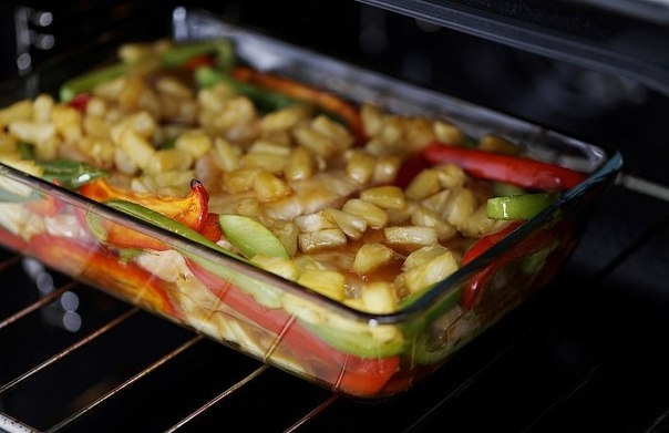 3 Выложите свинину в форму для запекания, маринад не выливайте. Рядом со свининой разложите перец и ананасы и запекайте до готовности свинины при 190 °C. При необходимости сбрызгивайте мясо оставшимся маринадом, а если свинина начнет слишком сильно подрумяниваться, накройте ее фольгой.
