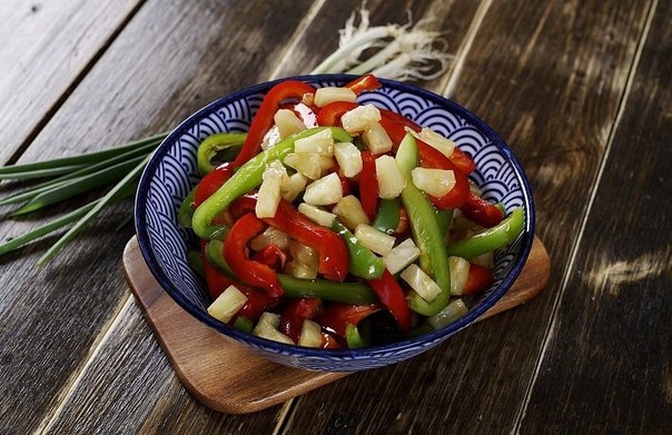 2 Болгарский перец нарежьте крупной соломкой, смешайте с кубиками ананаса и оставшимся соусом терияки.