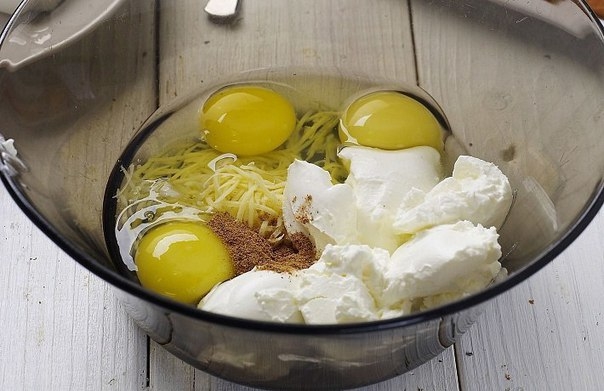 2 Смешайте сметану с яйцами и тертым сыром, приправьте мускатным орехом, посолите и поперчите.