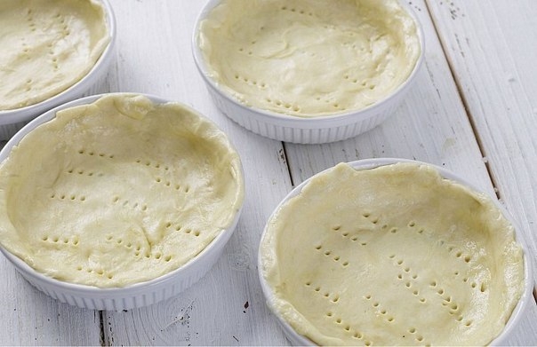 1 Замесите однородное тесто из муки, масла и воды, добавьте 1/2 чайной ложки соли. Разделите тесто поровну по количеству формочек, тонко раскатайте и положите в формочки, прижимая к бортикам, чтобы получились корзинки. Сделайте на тесте проколы вилкой. Дайте постоять полчаса, разогрейте духовку до 180 °С и выпекайте 10 минут.