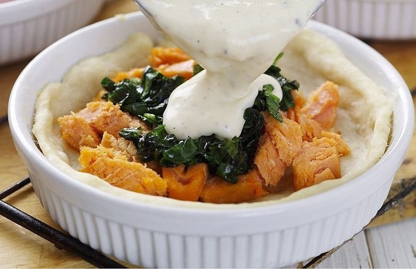 5 Залейте киши смесью сметаны, яиц и сыра — так, чтобы она покрывала начинку, но оставляла видимыми края теста.