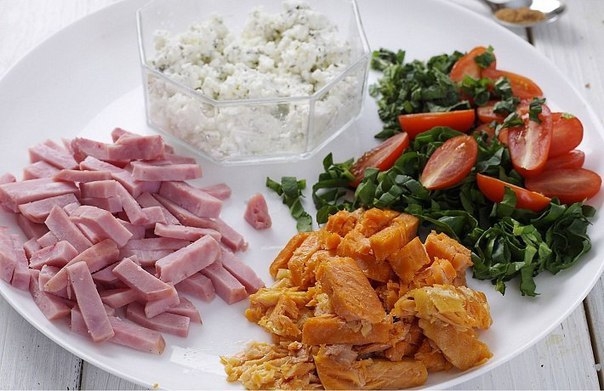 3 Нарежьте шпинат и слегка обжарьте на сливочном масле, посолите, поперчите и приправьте сушеным орегано. Лосося и ветчину нарежьте соломкой. Мяту измельчите. Фету приправьте сушеным орегано. Помидоры разрежьте на половинки.