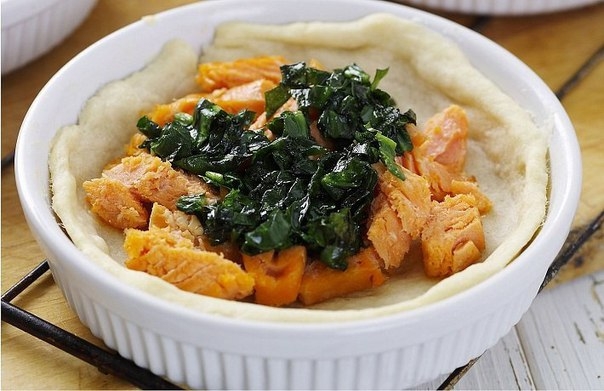 4 Разложите по формочкам с полуготовым тестом разные виды начинки: в одни киши положите шпинат с лососем, в другие — смесь феты и мяты, в третьи — помидоры и ветчину.