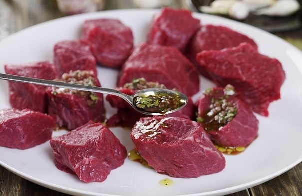 2 Нарежьте говядину кусочками по 4–5 см. Выложите мясо в миску и хорошо смешайте с маринадом, втирая его в куски. Накройте пленкой и оправьте в холодильник минимум на 4 часа. Достаньте мясо из холодильника за некоторое время до приготовления, чтобы оно нагрелось до комнатной температуры.