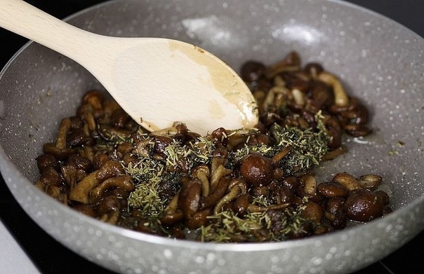 2 Опята нарежьте и обжарьте на огне выше среднего на 1 столовой ложке сливочного масла, приправив солью и перцем, в течение 3–4 минут, помешивая. Снимите с огня и вмешайте тимьян и розмарин.
