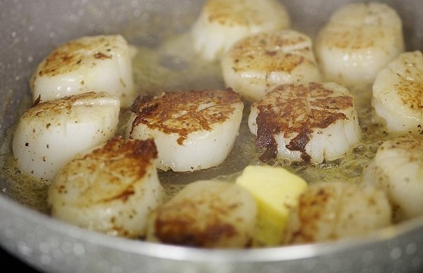4 Разогрейте на чистой сковороде 1 столовую ложку сливочного масла и обжаривайте гребешки 3–4 минуты с одной стороны. Затем добавьте еще ложку масла, переверните гребешки и обжаривайте столько же.