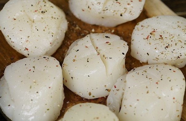 3 Сделайте на гребешках крестообразные надрезы с каждой стороны, вотрите в них соль и перец.