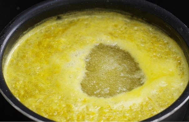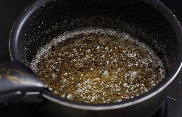 1 Растопите сахар в сотейнике на огне выше среднего. Помешивайте, пока он не обретет темно-янтарный цвет.