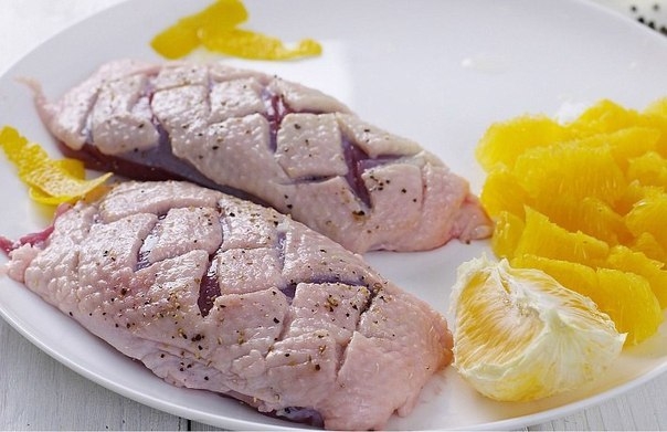 4 Сделайте несколько перекрестных надрезов на стороне утиной грудки с жиром, чтобы получился рисунок из ромбов. Приправьте грудки солью и перцем с обеих сторон.