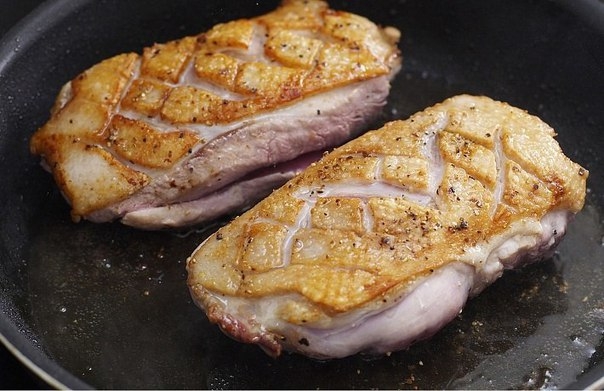 5 Положите грудки жиром вниз на сухую сковороду. Жарьте на огне выше среднего до румяной корочки. Переверните и жарьте с другой стороны до полной готовности. Перед тем как нарезать и подавать, дайте готовой утке постоять 10 минут.
