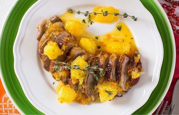 6 Апельсины разделите на дольки, очистите от пленок, нарежьте половинками и добавьте в соус. Утку нарежьте ломтиками и полейте апельсиновым соусом.