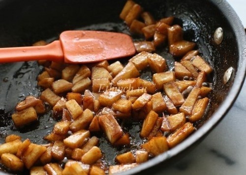 2) Приготовьте яблоки. Растопите 1 столовую ложку кокосового масла в небольшой сковороде и положите туда яблоки, сахар, корицу и мускатный орех. Обжаривайте около 3 минут, пока яблоки не станут мягкими. Но не переусердствуйте - яблоки не должны быть доведены до полной готовности, поскольку вам ещё предстоит выпекать их в духовке. Снимите их с плиты и отложите.