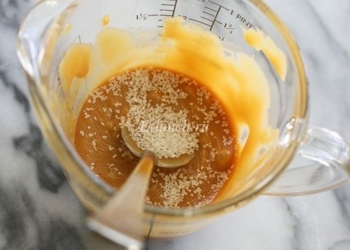 4) Приготовьте карамельный соус, добавьте в него кокосовое молоко (или воду, если у вас нет молока) и соль.