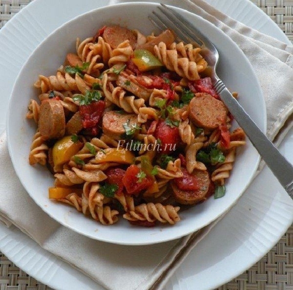 5. Переложите колбасу с помидорами в макароны и перемешайте. Посолите, поперчите по вкусу.