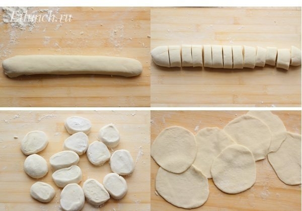 диаметром примерно 3 сантиметра. Нарежьте жгут одинаковыми по размеру кусочками, раскатайте каждый из них в виде кружочков с более тонкими краями.