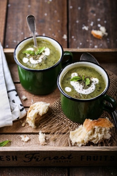 3.Измельчить суп погружным блендером, еще раз прогреть и снять с огня. Подавать с натуральным йогуртом или сметаной и свежим базиликом.