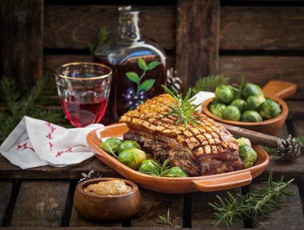 Если купили замороженные ребра , их нужно обязательно разморозить. Шкурку надрезаем ромбиками, прорезая острым ножем только верхний слой. Затем слегка натираем солью и кладем в прохладное место (холодильник) на сутки (в идеале на 3 дня ). Растираем в ступке можжевельник, перец, тимьян , розмарин и чеснок. Добавляем к смеси мед, вино, немного соли, цедру, растительное масло и натираем хорошенько ребра со всех сторон . Оставляем мариноваться на 4 часа . В форму для запекания наливаем воды примерно слоем 2 см , в центр формы ставим перевернутую вверх дном суповую тарелку, кладем ребра шкуркой вверх, получится , что ребра лежат горкой, центр немного возвышается , так вытопившийся жир будет стекать и корочка получится хрустящей. Плотно закрываем форму фольгой и ставим в заранее нагретую до 220 градусов духовку на 45 минут. Затем снимаем фольгу, убавляем температуру до 200 градусов и печем ребра еще 1-1,5 часа. Готовое мясо положите на горячее блюдо и дайте полежать несколько минут до подачи на стол.