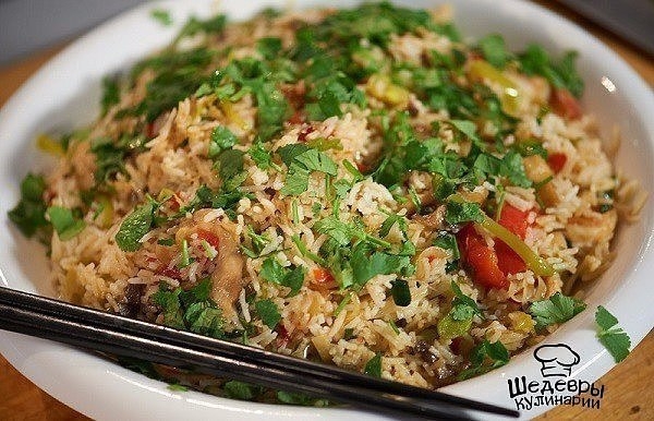 Лук и чеснок очистите, измельчите. Грибы промойте и нарежьте ломтиками. Из перца удалите сердцевину и нарежьте кубиком. Также нарежьте баклажаны, посыпьте солью и оставьте на 20 минут. С помидоров снимите кожицу, мякоть измельчите на кубики. Сварите рис до готовности. Разогрейте в кастрюле сливочное масло. Обжарьте лук и чеснок. Добавьте грибы, баклажаны, перец и помидоры. Посолите и поперчите по вкусу. Готовьте, помешивая, 6-7 минут. Добавьте рис, плотно закройте кастрюлю крышкой и готовьте 10-15 минут