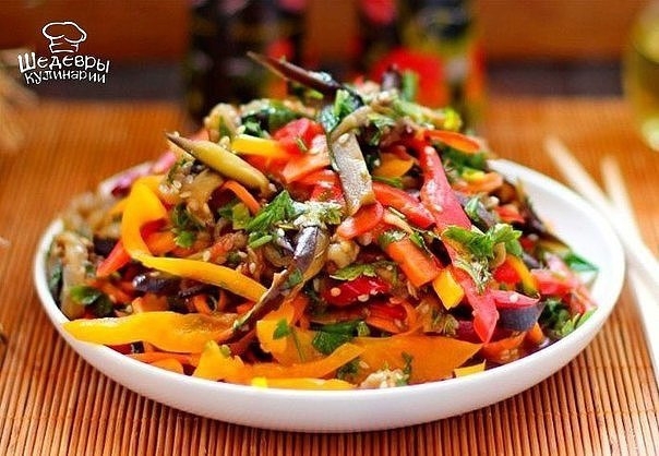 Баклажаны вымойте, отрежьте плодоножки и выложите в кастрюлю с кипящей соленой водой. Варите около 20 минут. Затем нарежьте их тонкими полосками. Зелень укропа, чеснок и чили мелко нарежьте. Репчатый лук и болгарский перец нашинкуйте мелкой соломкой. Соедините все ингредиенты, смешайте и добавьте специи. Заправьте салат растительным маслом и уксусом. Дайте настояться в течение 30 минут и подавайте.