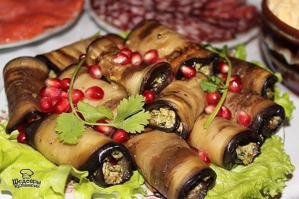 Баклажаны помойте и нарежьте на продольные ломтики толщиной 5 мм. Присыпьте солью и оставьте на 40 минут. Затем обжарьте ломтики с двух сторон. Измельчите в блендере зелень и орехи. Добавьте пропущенный через пресс чеснок, майонез и кориандр. Перемешайте начинку. Посолите по вкусу. На край баклажанного ломтика положите чайную ложку с горкой начинки и сверните рулетиком.
