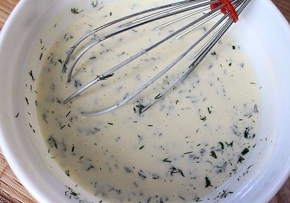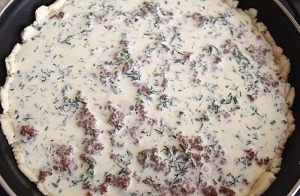 Теперь готовим заливку. Сметану (можно пополам с майонезом) смешиваем с хорошо взбитыми яйцами. Солим, перчим, добавляем другие специи, если хотите. От вкуса заливки во многом зависит вкус пирога! Можно добавить рубленную зелень, я добавила укроп.