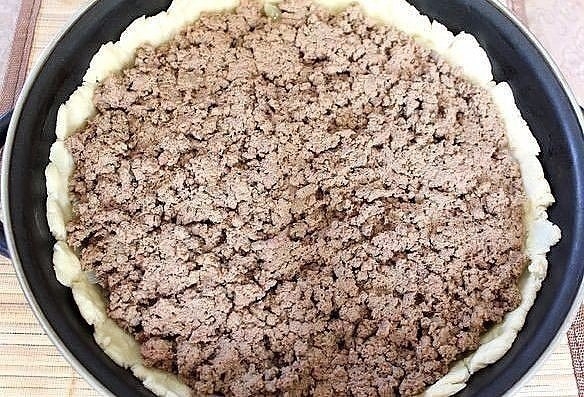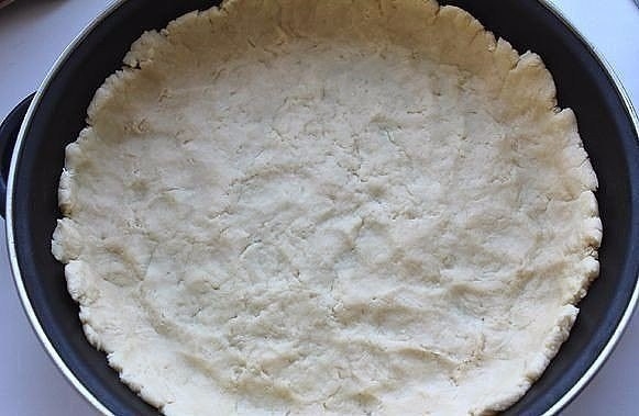 Приступаем к сборке пирога. Форму, можно брать любую (круглую, прямоугольную), смазываем маслом и равномерно распределяем тесто, делаем высокие бортики.