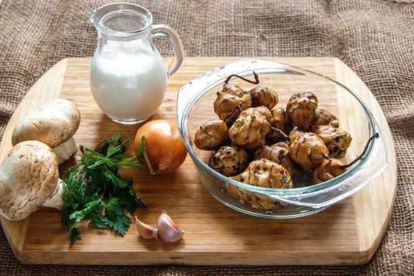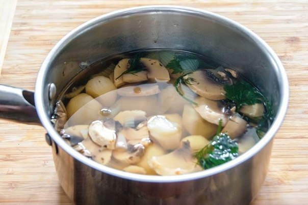 Положить в кастрюлю грибы, топинамбур, лук, чеснок, зелень, залить кипятком (примерно 1л).