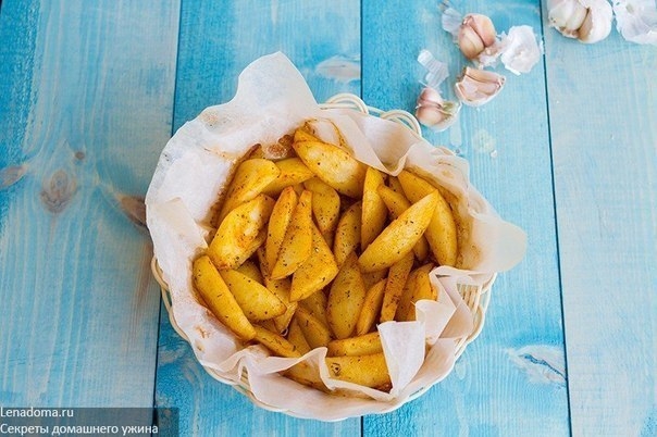 Я выстилаю форму пергаментом и подаю картошку прямо в пергаменте на корзинке для хлеба. Это удобно и красиво. Такой картофель вкусная самостоятельная закуска для компании.