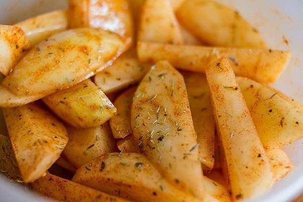 2. Хорошо перемешать со специями и растительным маслом (1 ст.л. на 1 среднюю картошку). Если добавляете паприку, перца нужно совсем чуть-чуть.