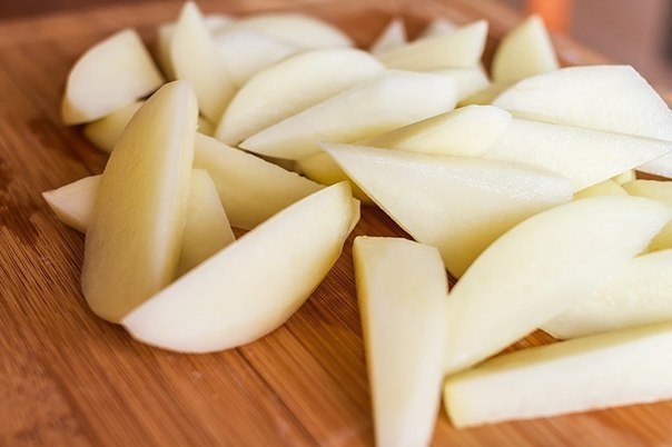 1. Духовку разогреть до 225 градусов. Картофель нарезать дольками. Как? Смотри видео-урок .