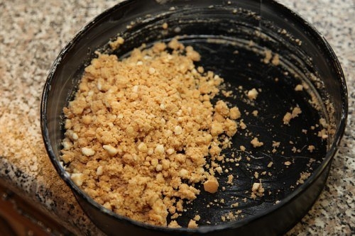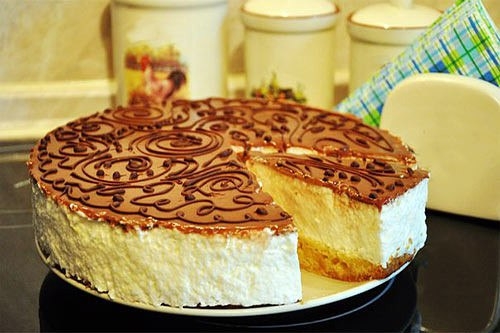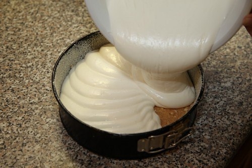Разрезам корж по высоте пополам. Одну часть кладём на дно формы и поверх выкладываем суфле, накрываем второй половиной коржа (я делала только из одной половины коржа). Отправляем торт в холодильник на 1,5 – 2 часа.