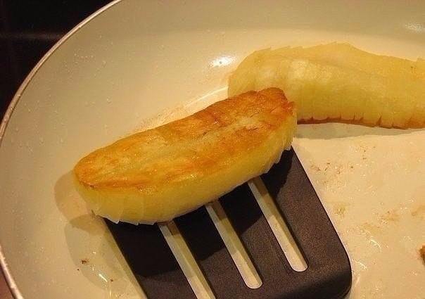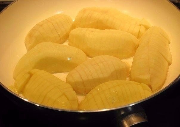 1. Готовить проще некуда. Разрезаем картошку пополам, а потом нарезаем поперек на тонкие ломтки, но не до конца, а то на сковороде картошка развалится(я пробовала, но на вкусе это не отражается). Как я уже писала, берем картошки такое количество, какое позволяет диаметр вашей сковороды(у меня 26 см и нам хватило на двоих). Картошка