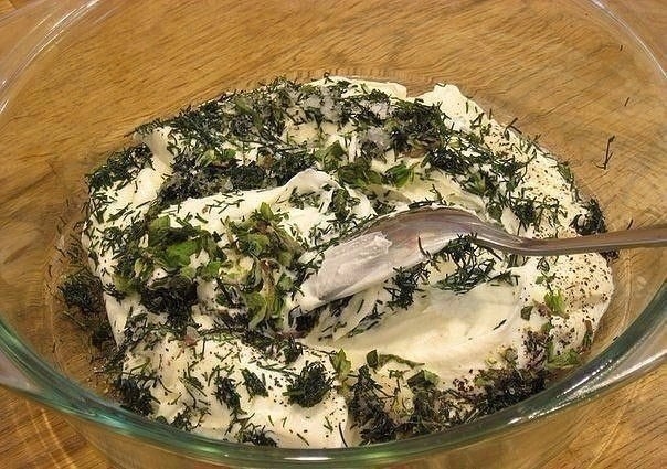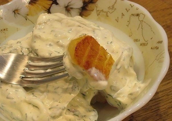 4. Пока жарилась картошка, готовим соус. Сметану смешиваем с солью, нарезанной зеленью укропа, черным молотым перцем и выдавленным чесноком. Тщательно перемешиваем и готово.