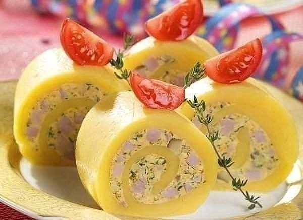6. Обалденный рулет из сыра, ветчины и шампиньонов.