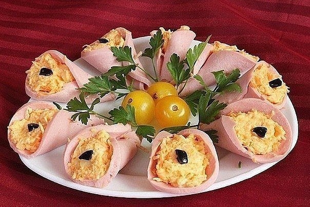 1. Колбасу порежьте тонкими пластинами. Из каждой пластинки сверните кулечек-колокольчик и заколите его шпажкой (я использовала зубочистки)