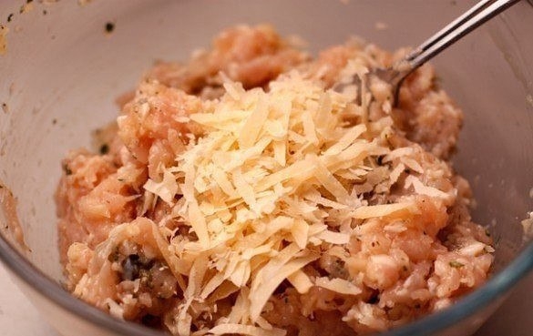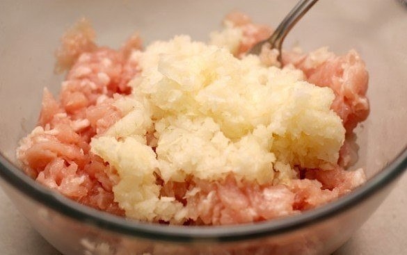 Луковицу очистить и хорошенько измельчить (лучше всего при помощи блендера или потереть на терке) и добавьте к фаршу вместе с яйцом.