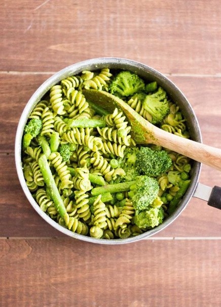 4. Смешать пасту, овощи и песто (возможно все и не потребуется). Добавить сохраненную жидкость, чтобы разбавить песто. Приправит солью с перцем по вкусу.