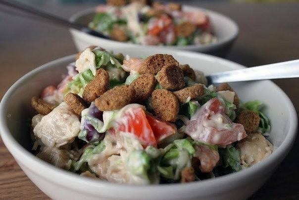3. Смешиваем все нарезанные и готовые ингредиенты, заправляем майонезом (сметаной). Подавать такой салат можно посыпав сверху сухариками.