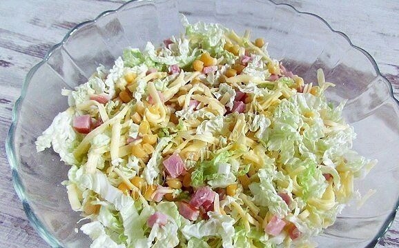 Пекинскую капусту тонко нашинкуйте. Ветчину нарежьте кубиками или соломкой. Сыр натрите на крупной терке. Соедините капусту, ветчину и сыр. Добавьте консервированную кукурузу. Поперчите по вкусу, добавьте майонез и перемешайте. Солить салат не рекомендую, так как сыр, ветчина и майонез сами по себе достаточно соленые. Перед подачей на стол добавьте в салат сухарики и аккуратно перемешайте.