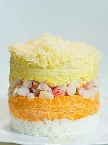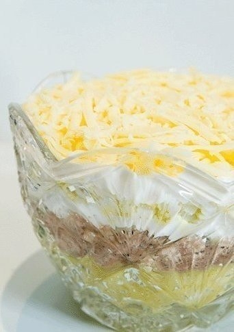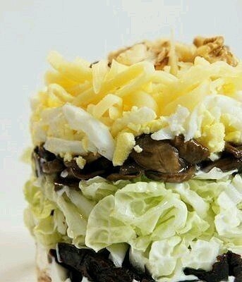 Наиболее эффектно этот салат смотрится, если собирать его в обратном порядке в неглубокой посуде, а потом перевернуть на тарелку.Для этого можно взять эмалированную литровую кружку, ковшик или сотейник.
