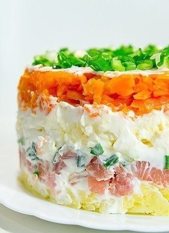 Когда салат пропитается, извлечь его на тарелку, сняв плёнку.Ставший верхним морковный слой слегка смазать майонезом и украсить зелёным луком.Если Вы собираетесь собирать салат классическим методом, без переворачивания, то описанный выше порядок слоёв нужно поменять.