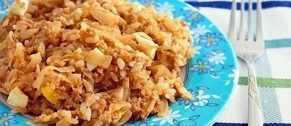 Пусть еще потушится немного. Затем добавляю некоторое количество сырого - круглого, не пропаренного риса...Кладу его сверху капусты, не перемешивая и доливаю столько воды , чтобы чуть прикрыть рис. Тушу минут 15 под крышкой ... Под конец кладу прокрученное вареное мясо ( говядину )сверху. Мешаю чуть позже...(чтобы блюдо не пригорело). Довожу до готовности риса под крышкой на медленном огне. Если рис еще сыроват , а воды маловато, добавляю чуть водички...Голубцы готовы. Кладу в них 2 -3 вареных яичка , мелко порезанных, перемешиваю. Получается очень нежное и вкусное блюдо.Особенно хорошо едят дети...