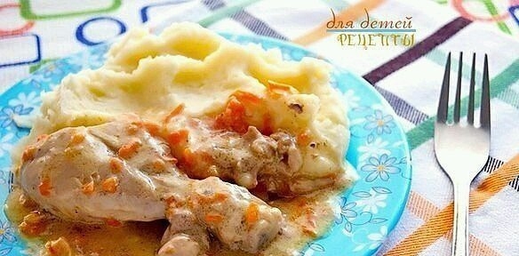 Перемешать и потушить под крышкой минут 5-10. Если соус получился густоват, то сверху долить немного молока, сковородку встряхнуть. Готово! Выложить готовую курочку на тарелку с рисом ( у меня с пюре), полив сверху соусом.