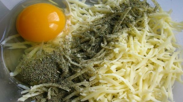 В половину сыра добавьте яйцо и киньте сушеную зелень, тщательно перемешайте. Эта смесь нам понадобится для смазывания нашего пирога, чтобы у него появилась золотистая и хрустящая корочка.