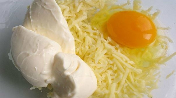 Второе яйцо и оставшийся сыр смешиваем с чесноком и майонезом. Это нам понадобится для приготовления самого пирога.