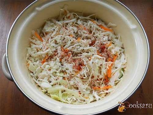 Далее вновь капуста, огурцы, чеснок. Верхним слоем должна быть капуста. Всыпать сверху кориандр и посыпать паприкой.