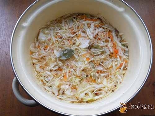 Также сверху поместить лавровый лист. Приготовить маринад: воду с солью и сахаром довести до кипения, влить растительное масло и уксус. Кипятить маринад 1-2 минуты, после чего горячим - залить капусту с огурцами. Далее сверху капусты поместить небольшой гнет и оставить на 7-8 часов при комнатной температуре.